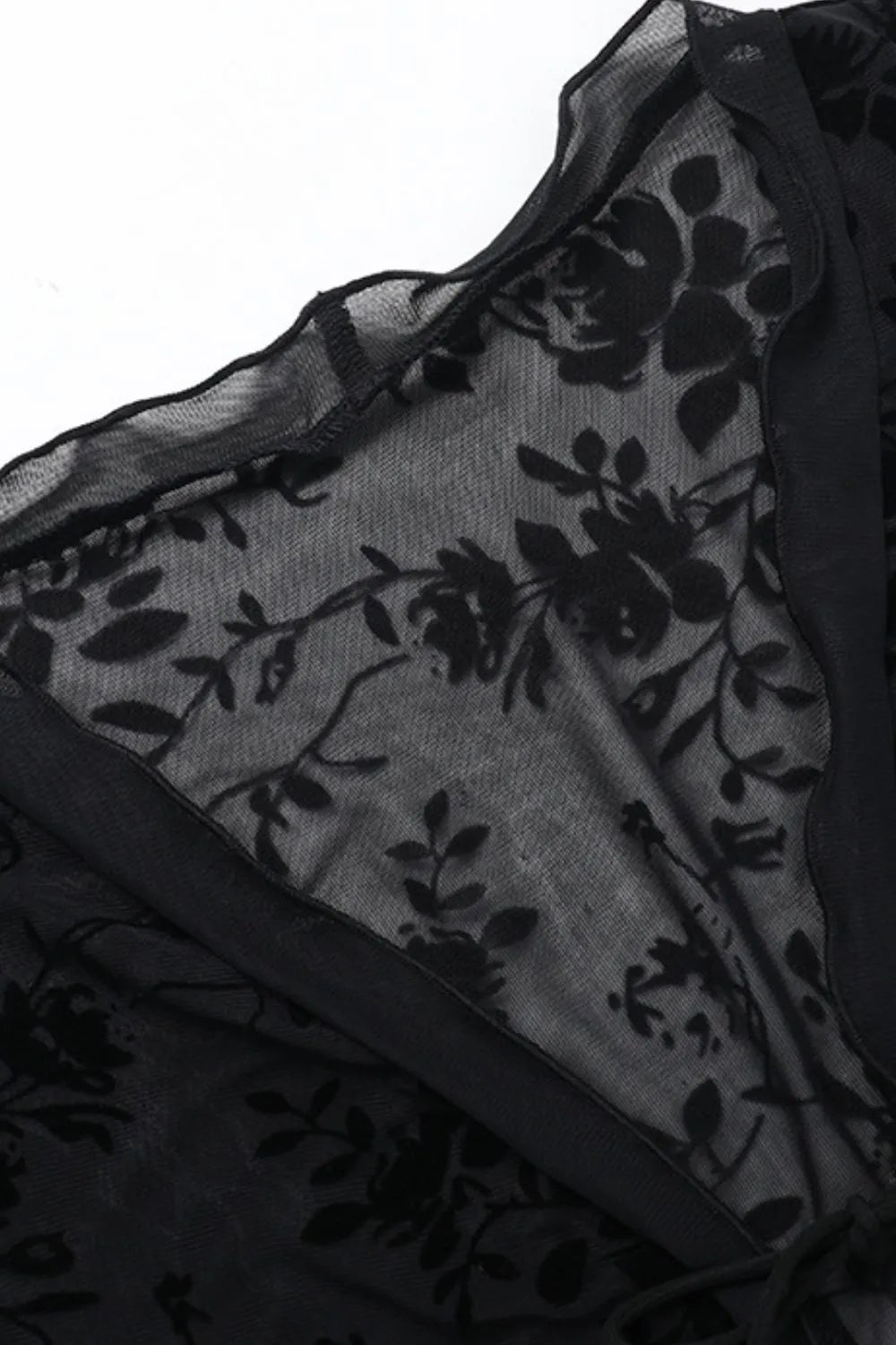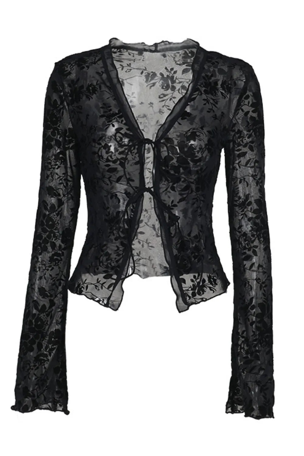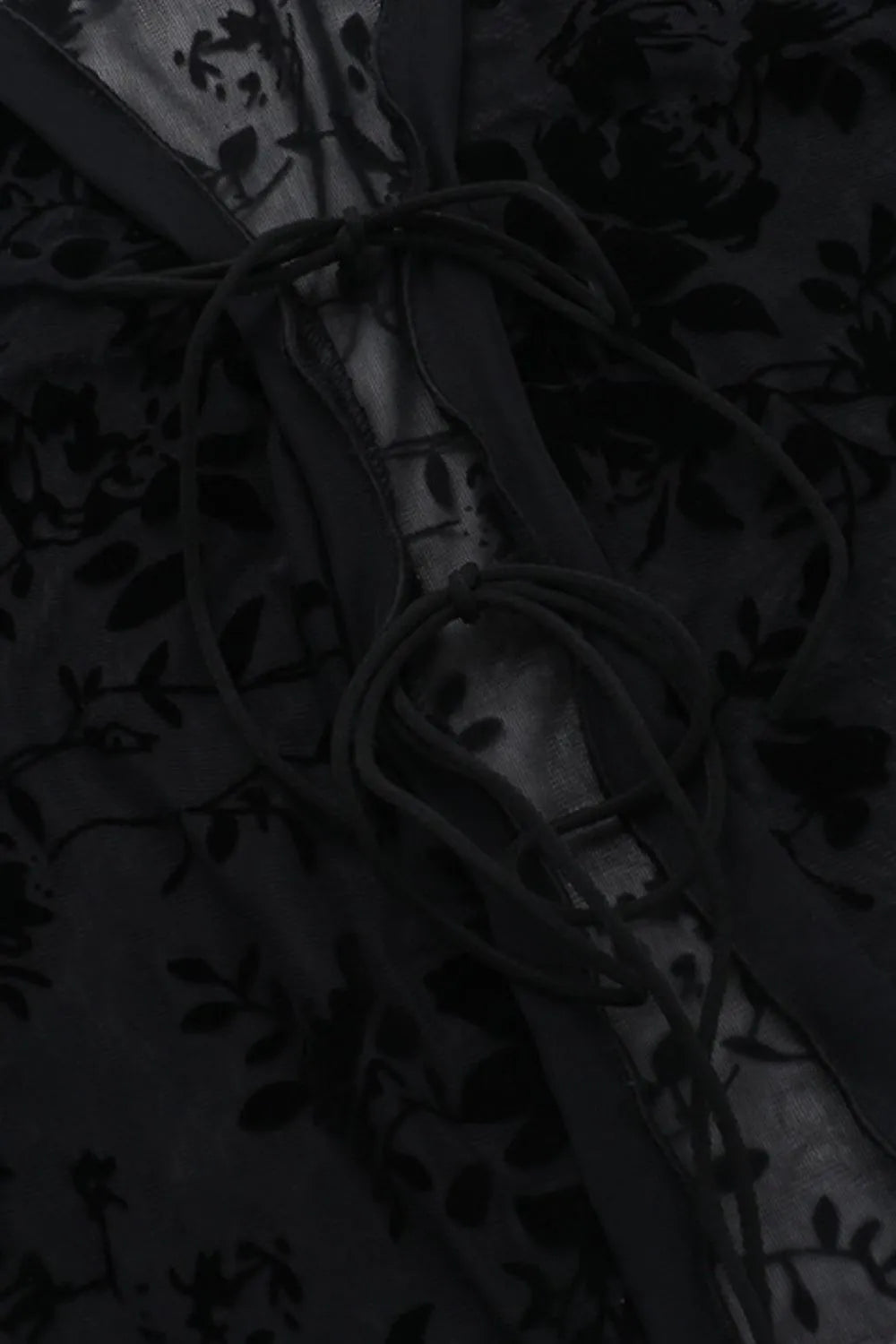 Features: Tied, Lace Sheer: Semi-sheer Stretch: Slightly stretchy Material composition: 85% chiffon, 25% polyester Care instructions: Machine wash cold. Tumble...