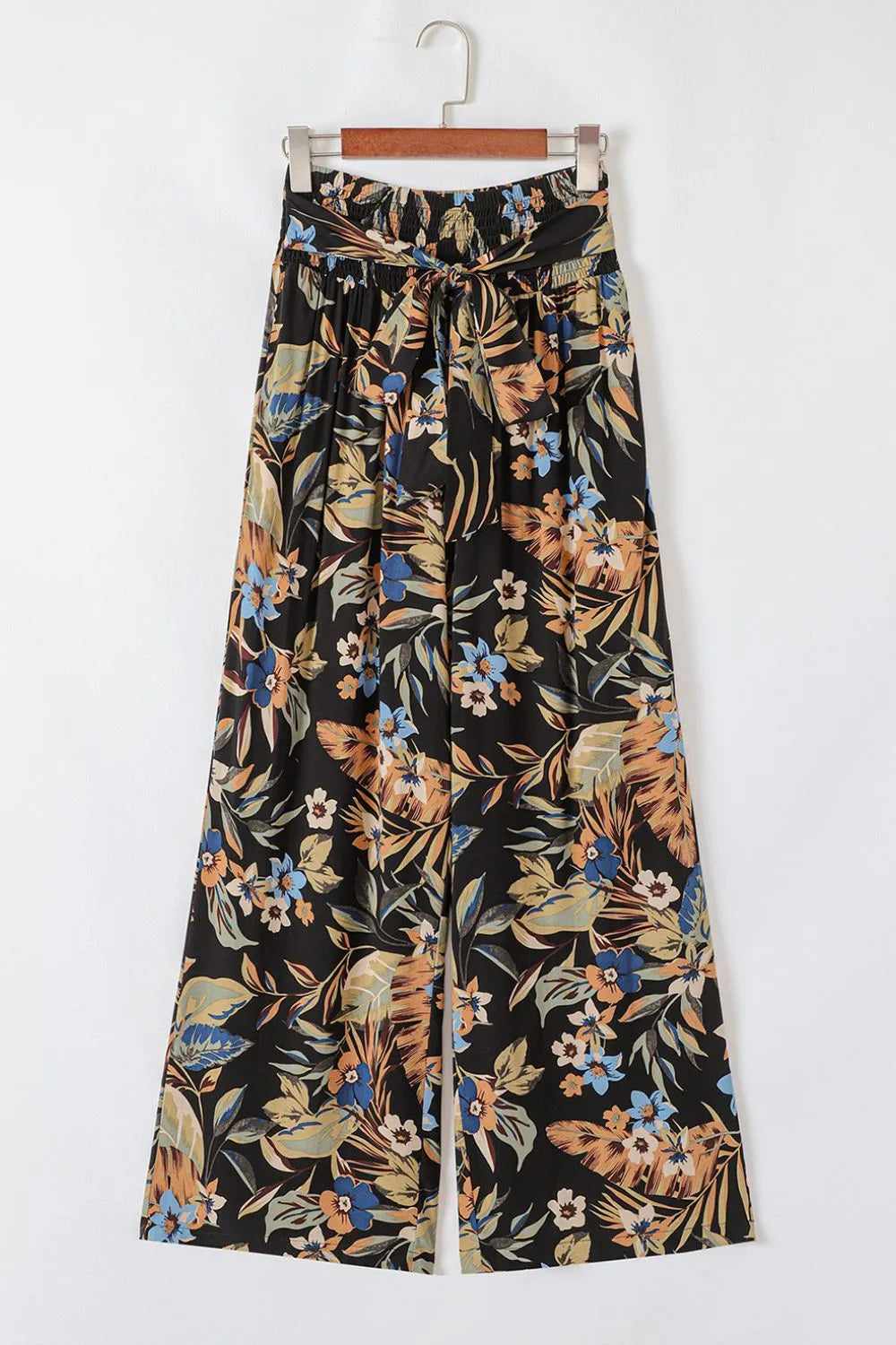 Floral Shirred High Waist Wide Leg Pants with Tie