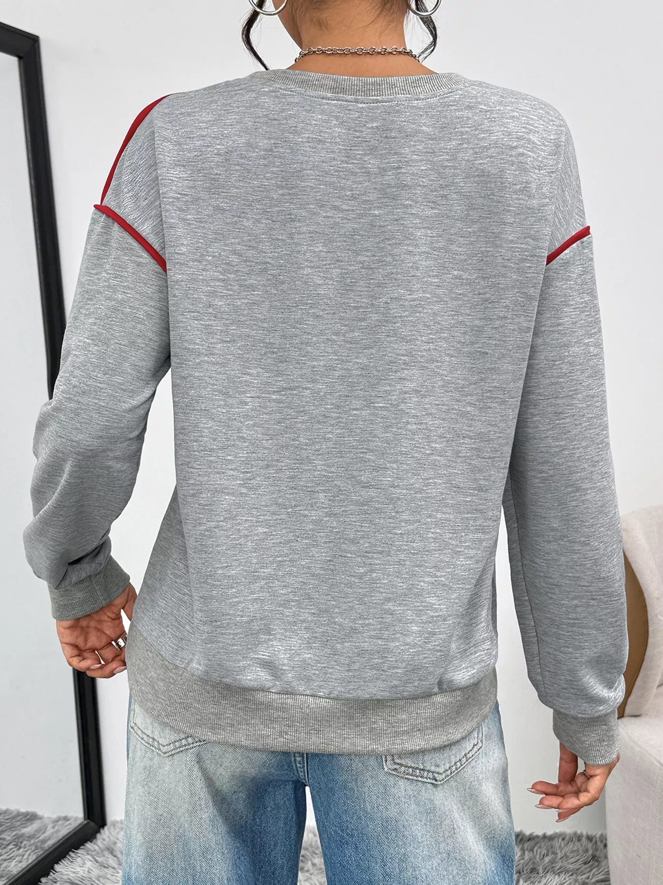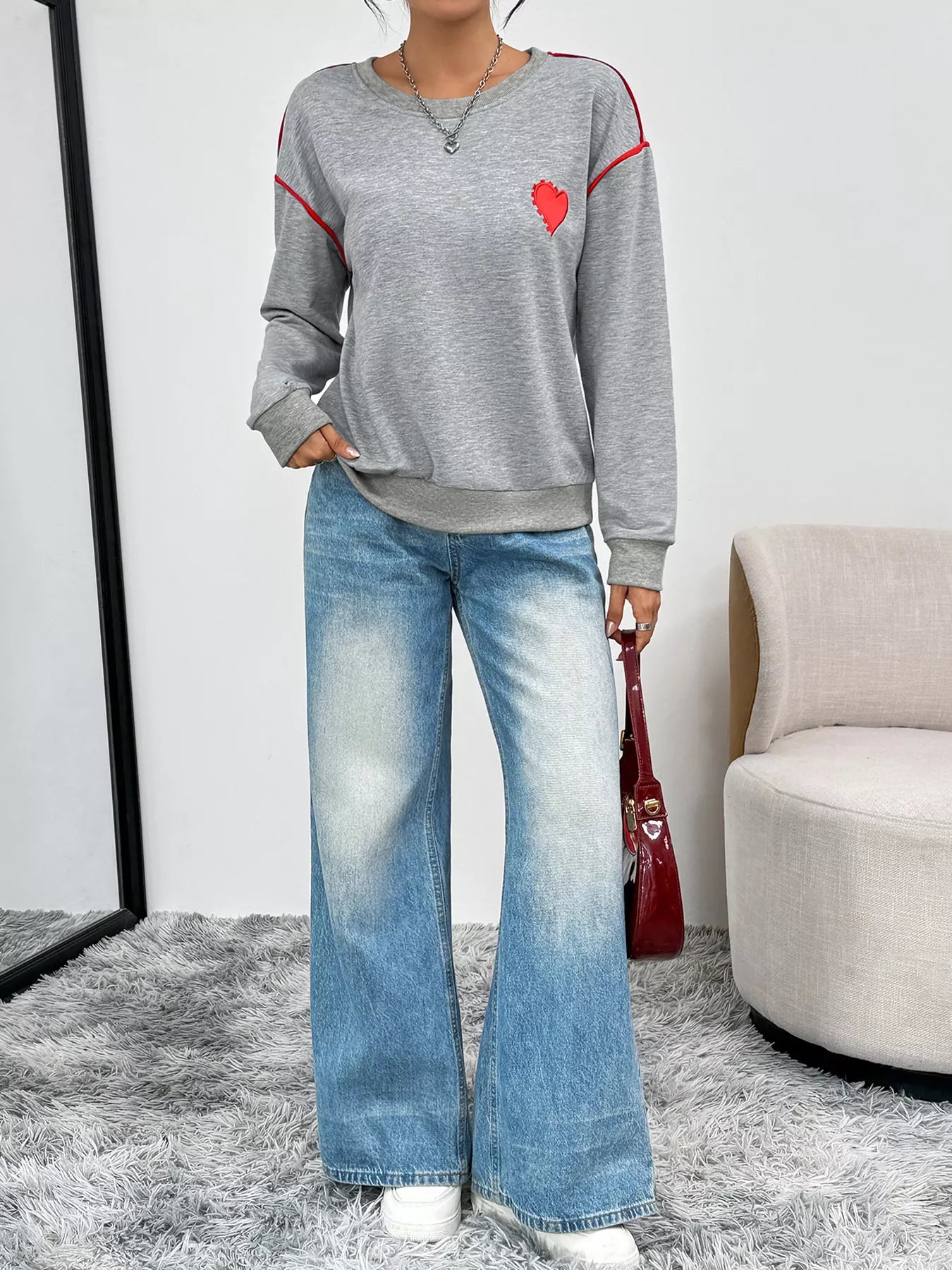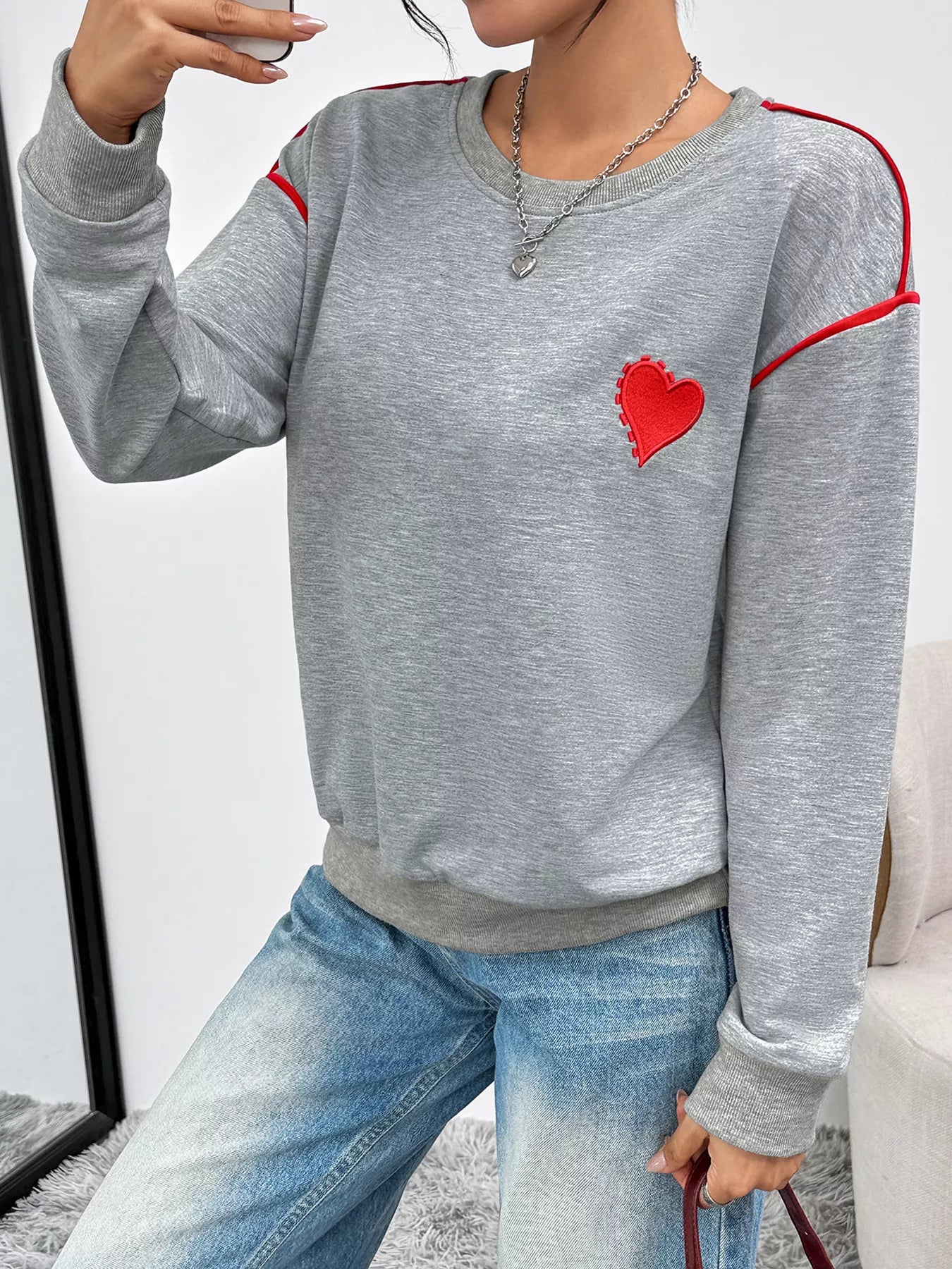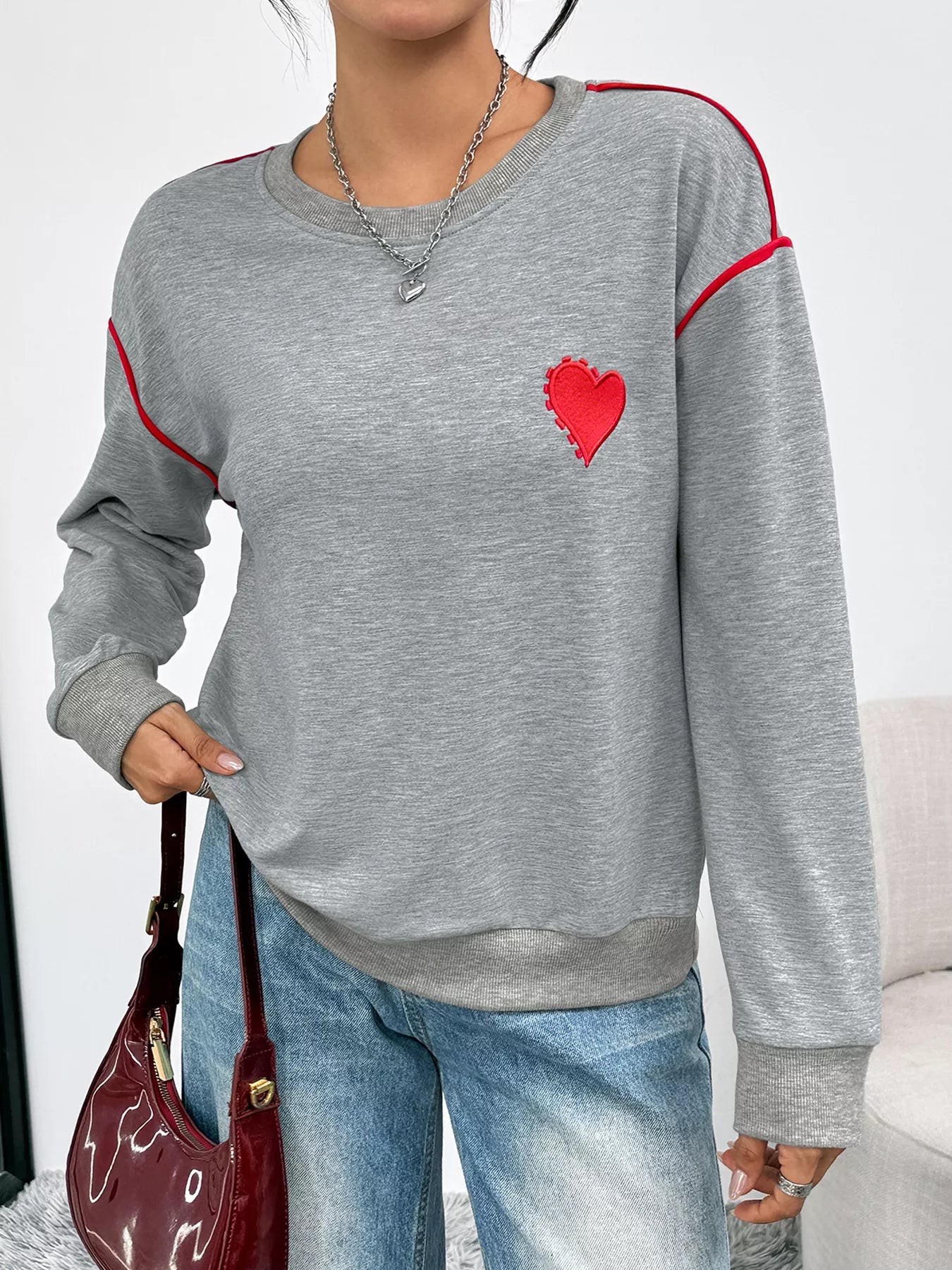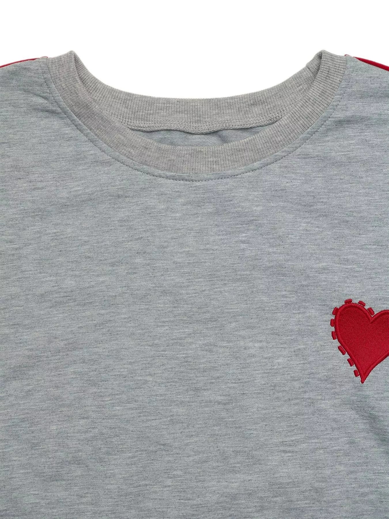Heart Embroidered Round Neck Sweatshirt
