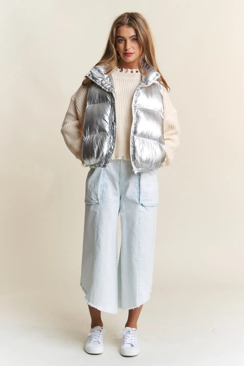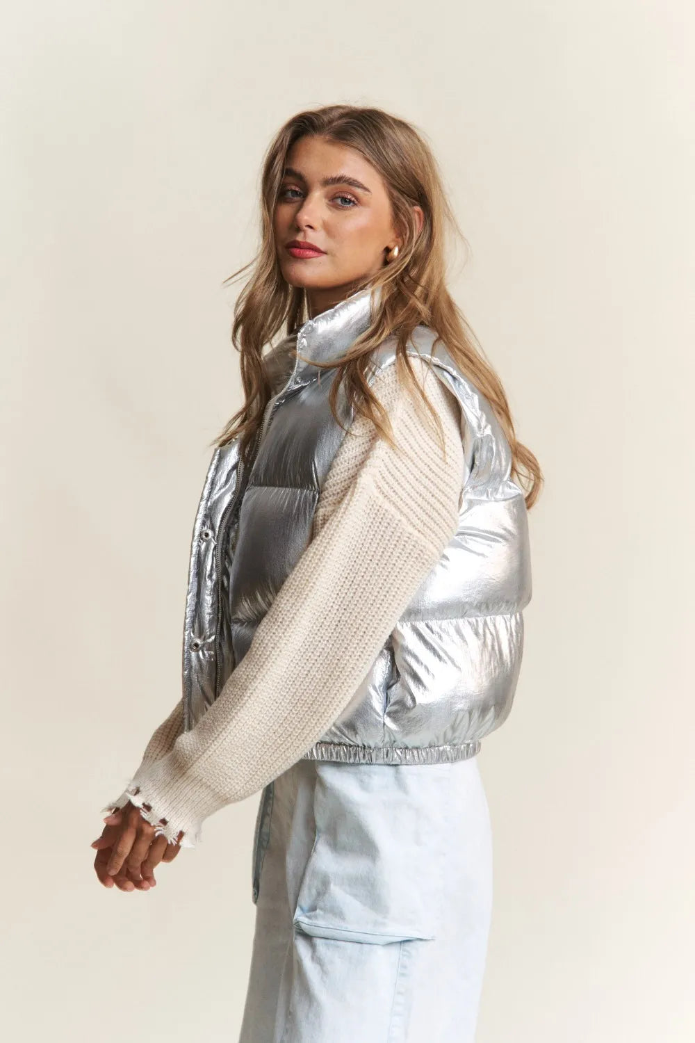 J.NNA Snap and Zipper Shiny Metallic Puffer Vest
