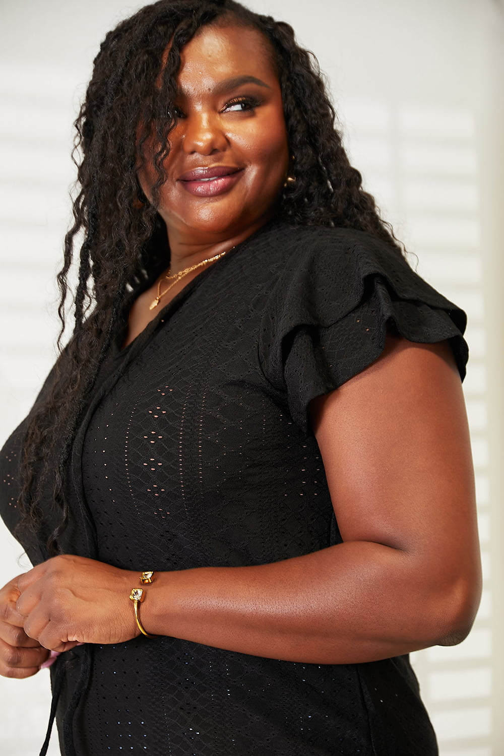 Elevate your style with this stunning Eyelet Tie-Neck Flutter Sleeve Blouse. The intricate eyelet design and flutter sleeves give a...