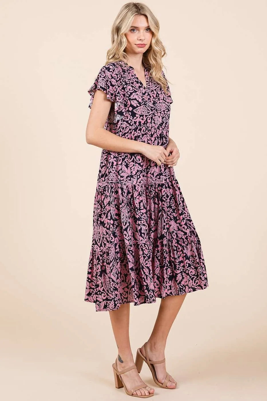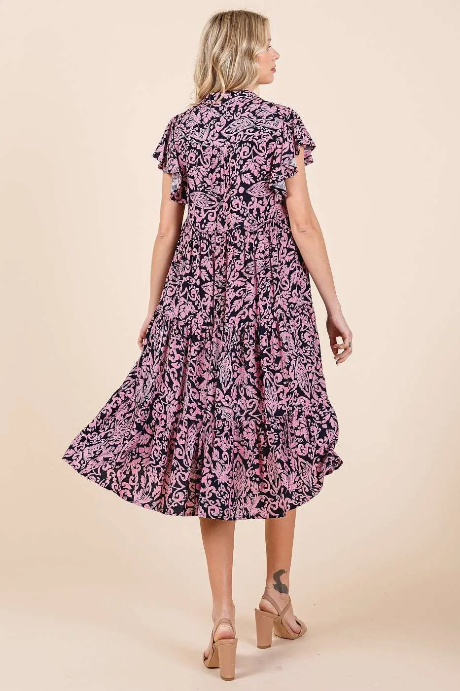 This midi dress showcases an abstract print design with ruffle tier accents for a chic and stylish look. Perfect for...