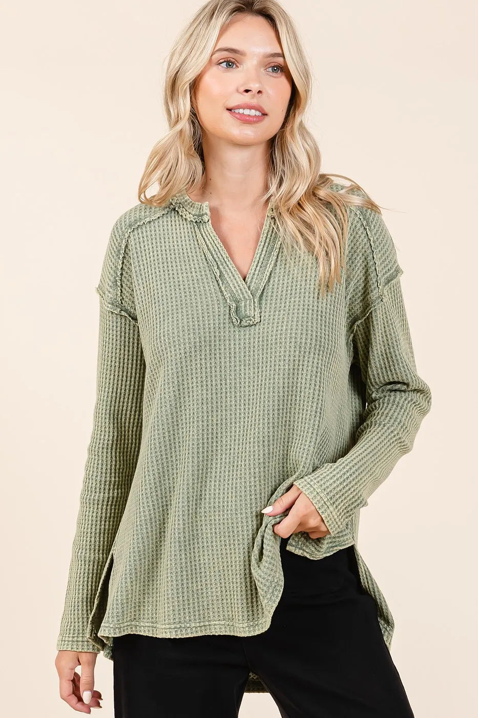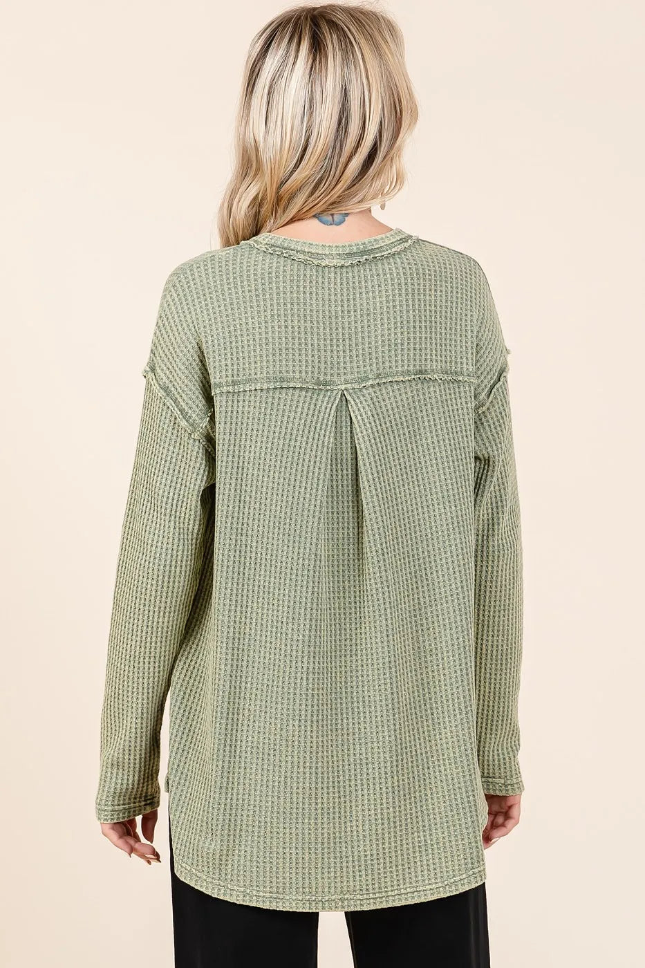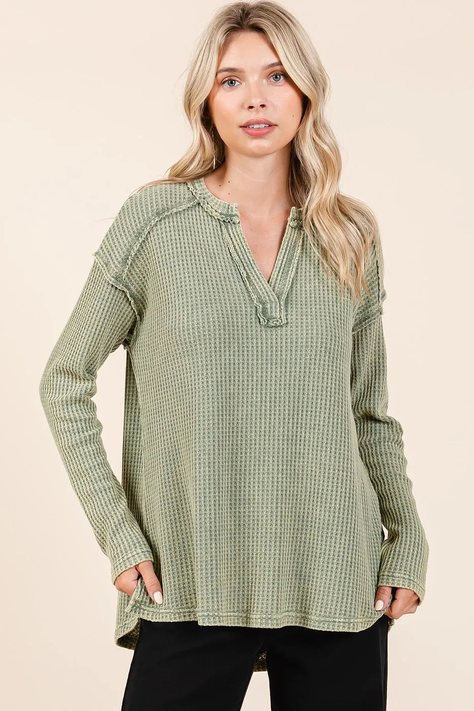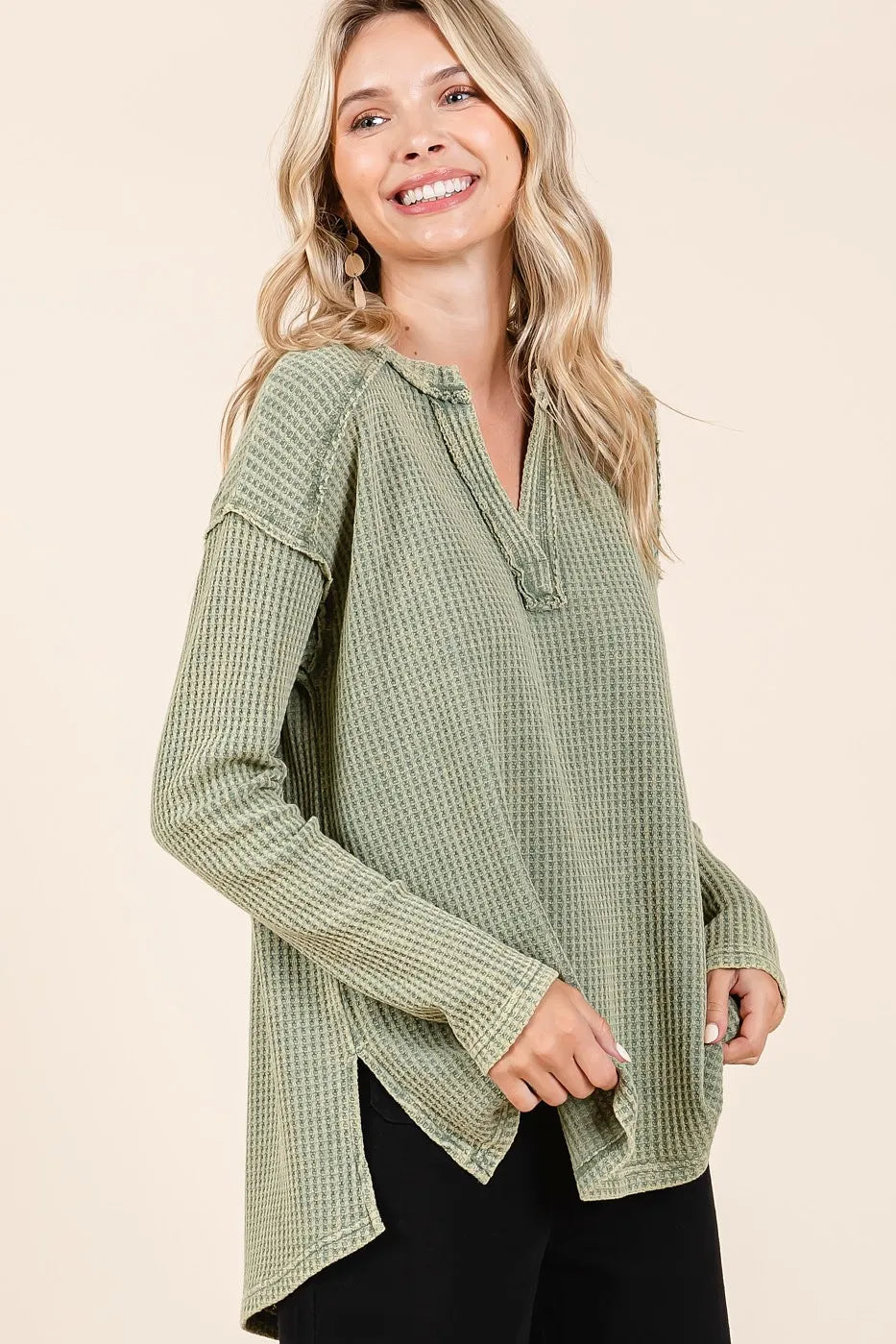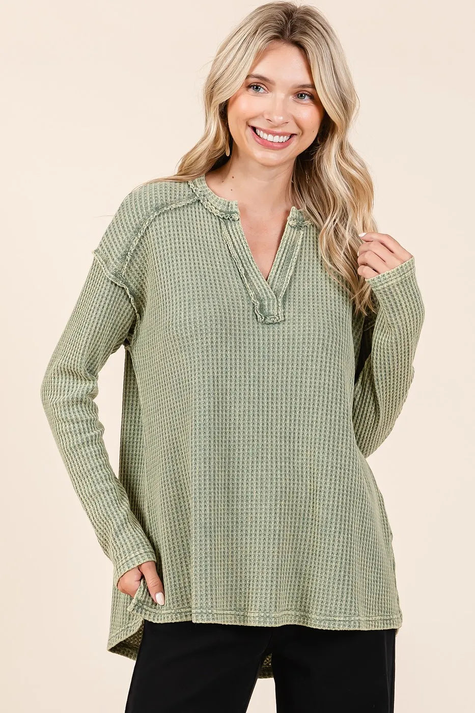 Mittoshop Mineral Wash Waffle Knit V-Neck Long Sleeve Top