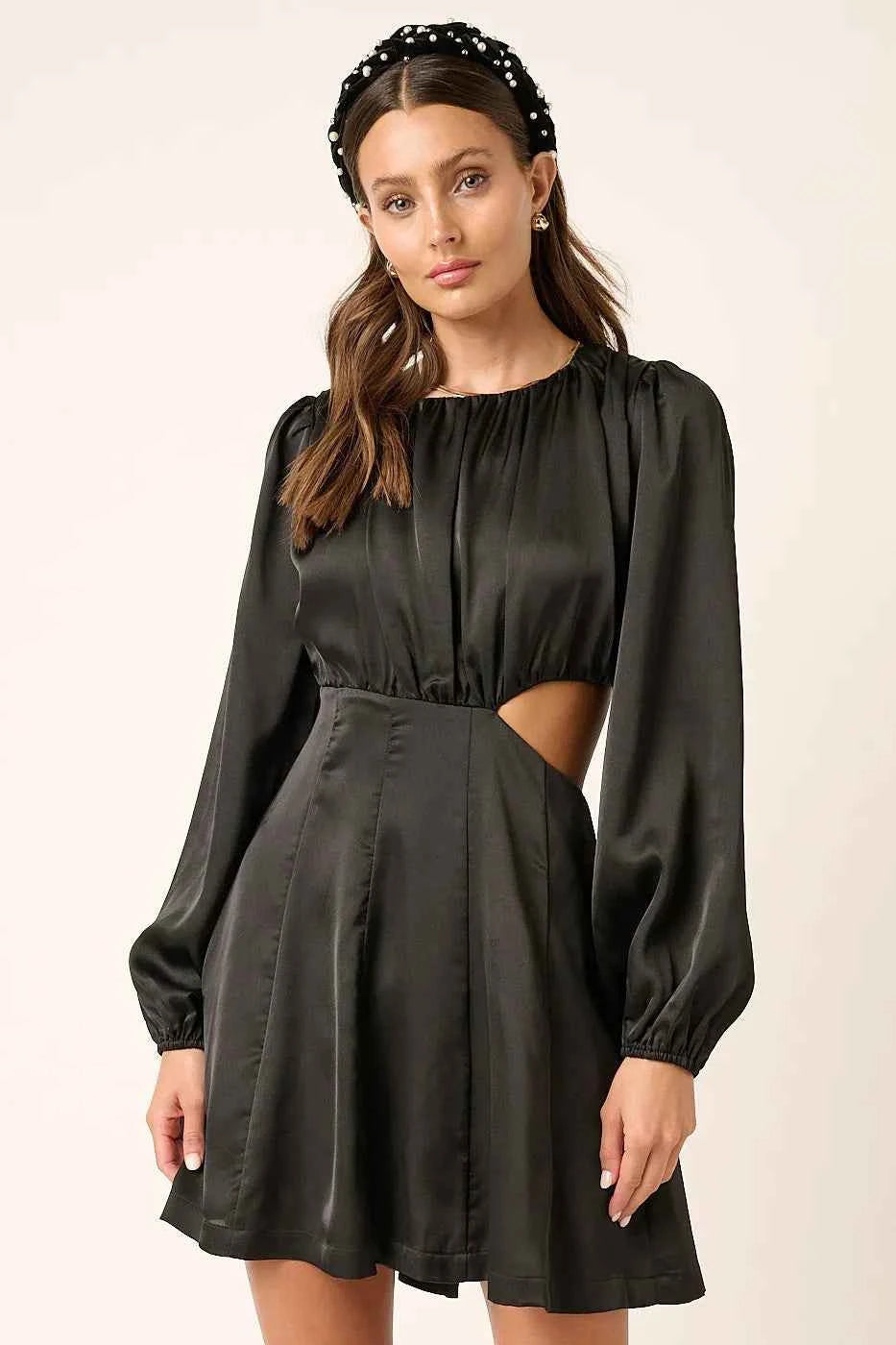 This mini dress features side cutout details and is made from luxurious satin fabric for a chic and sophisticated look....