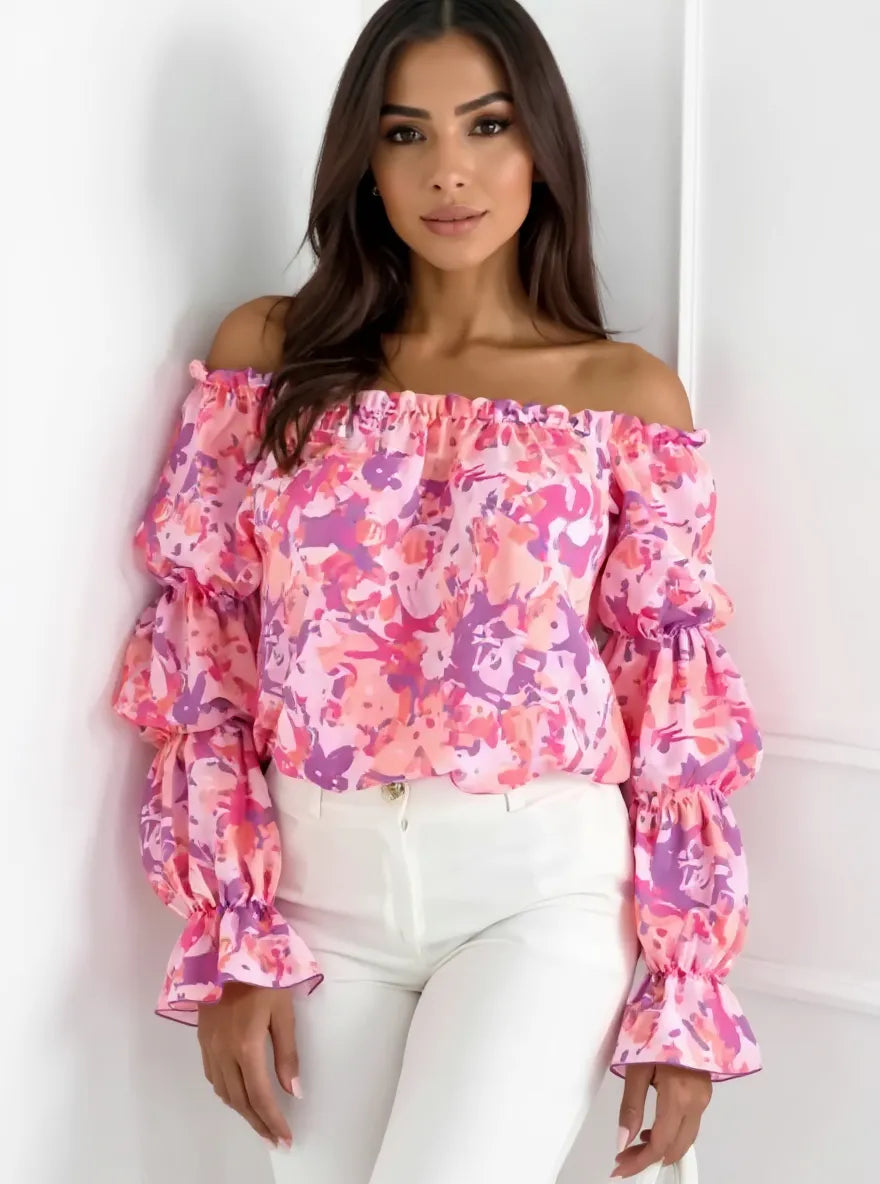 Off-Shoulder Floral Ruffle Blouse with Elastic Neckline