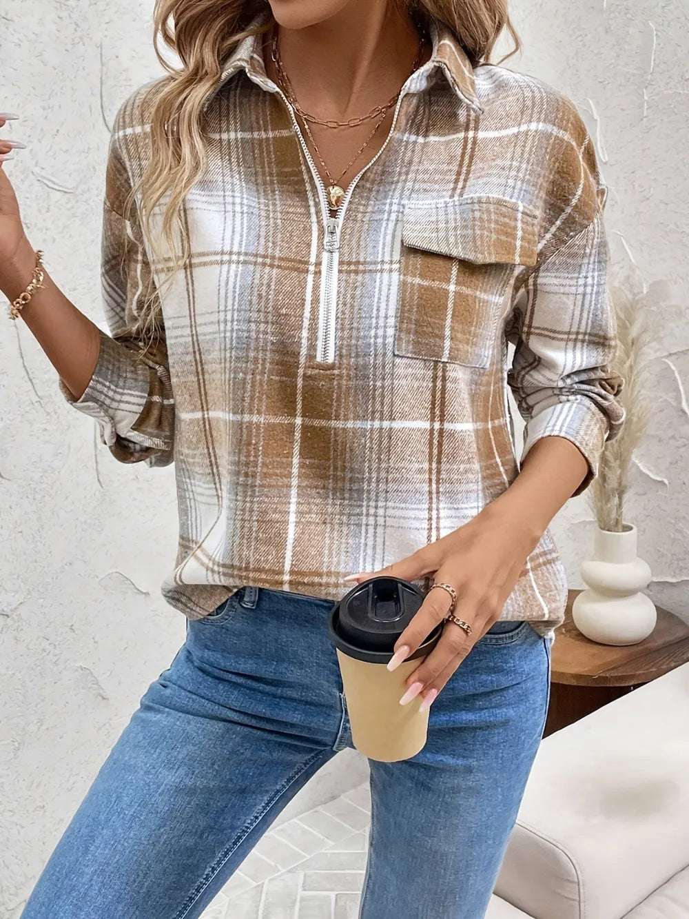 Plaid Collared Neck Half Zip Long Sleeve Top