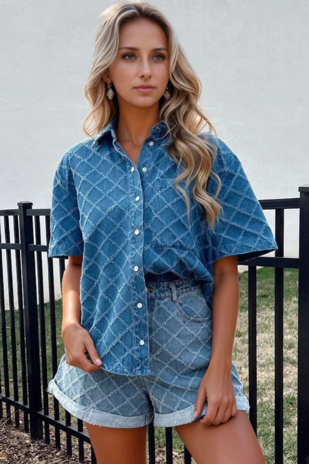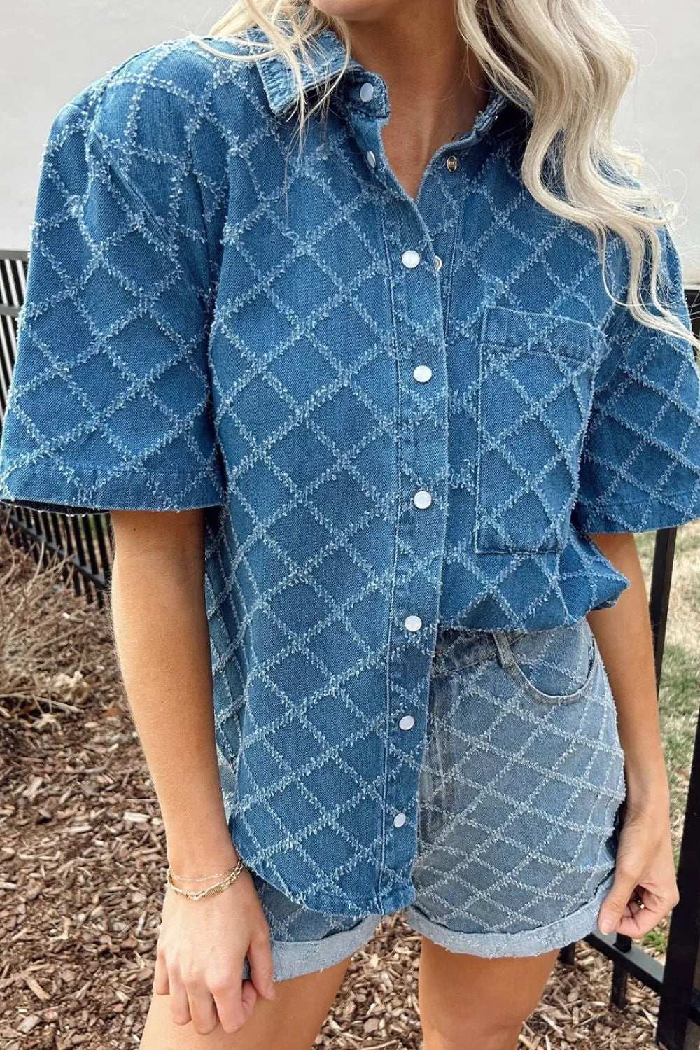 Pocketed Collared Neck Short Sleeve Denim Shirt