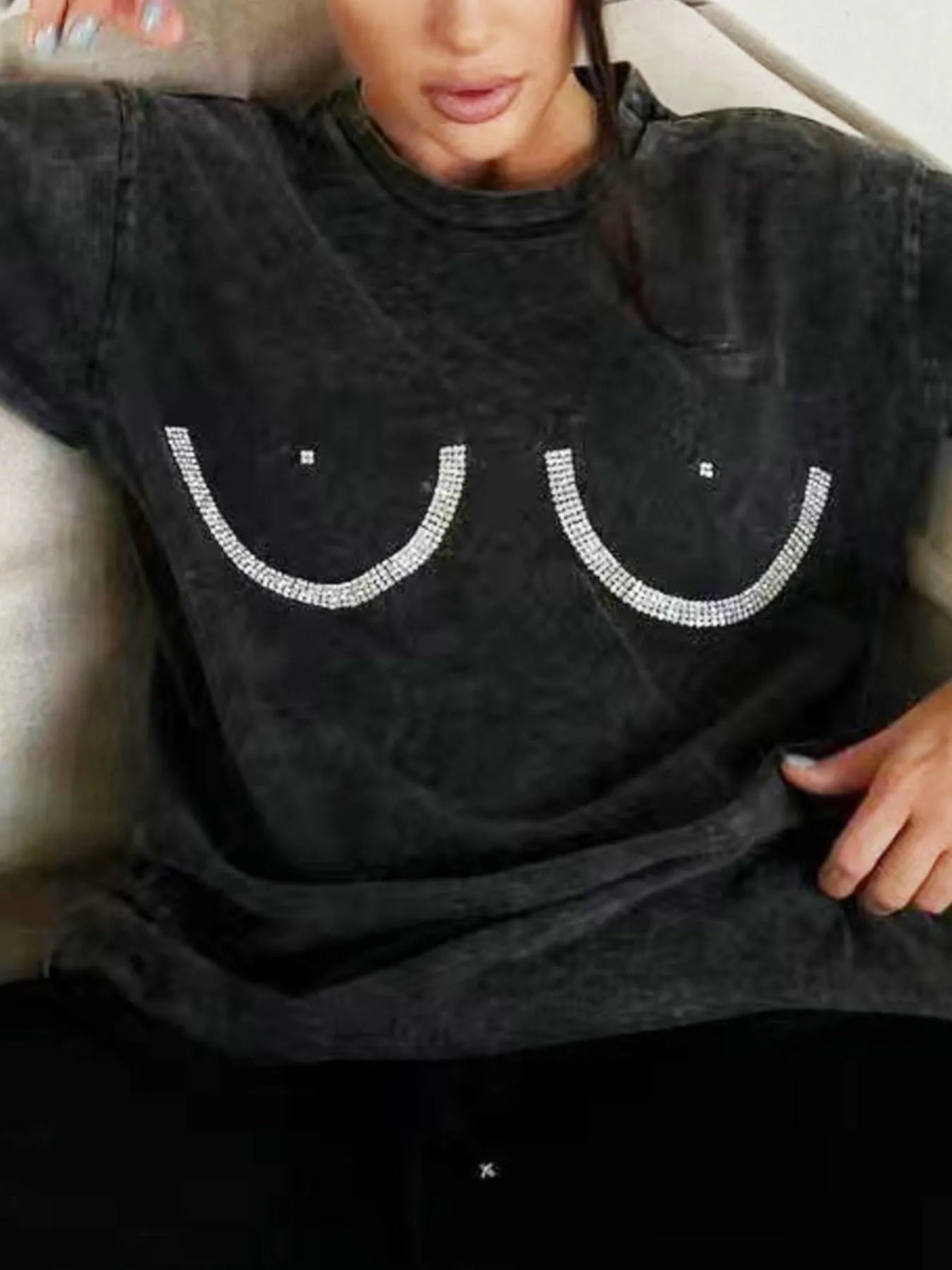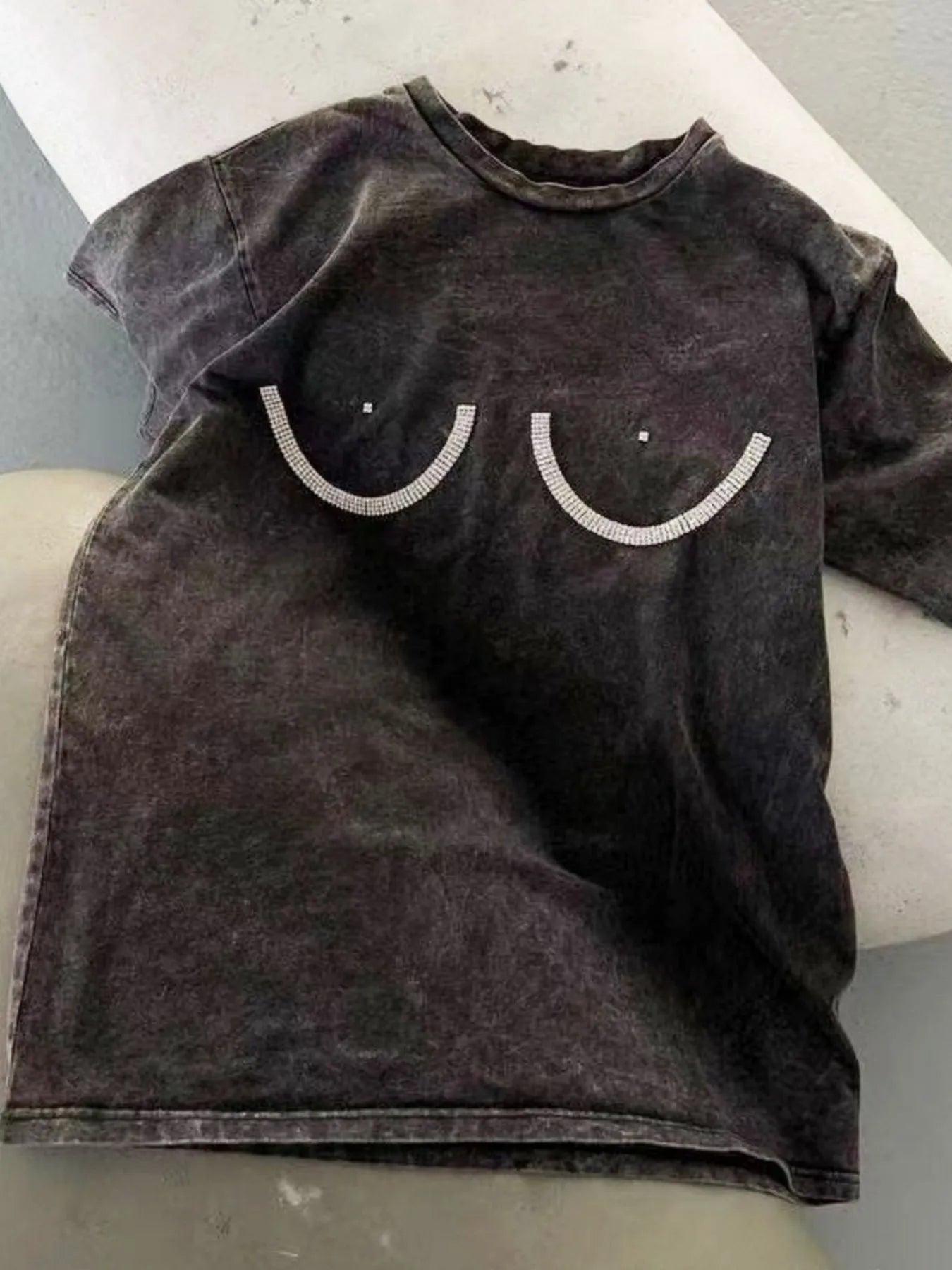 Rhinestone Round Neck Washed T-Shirt