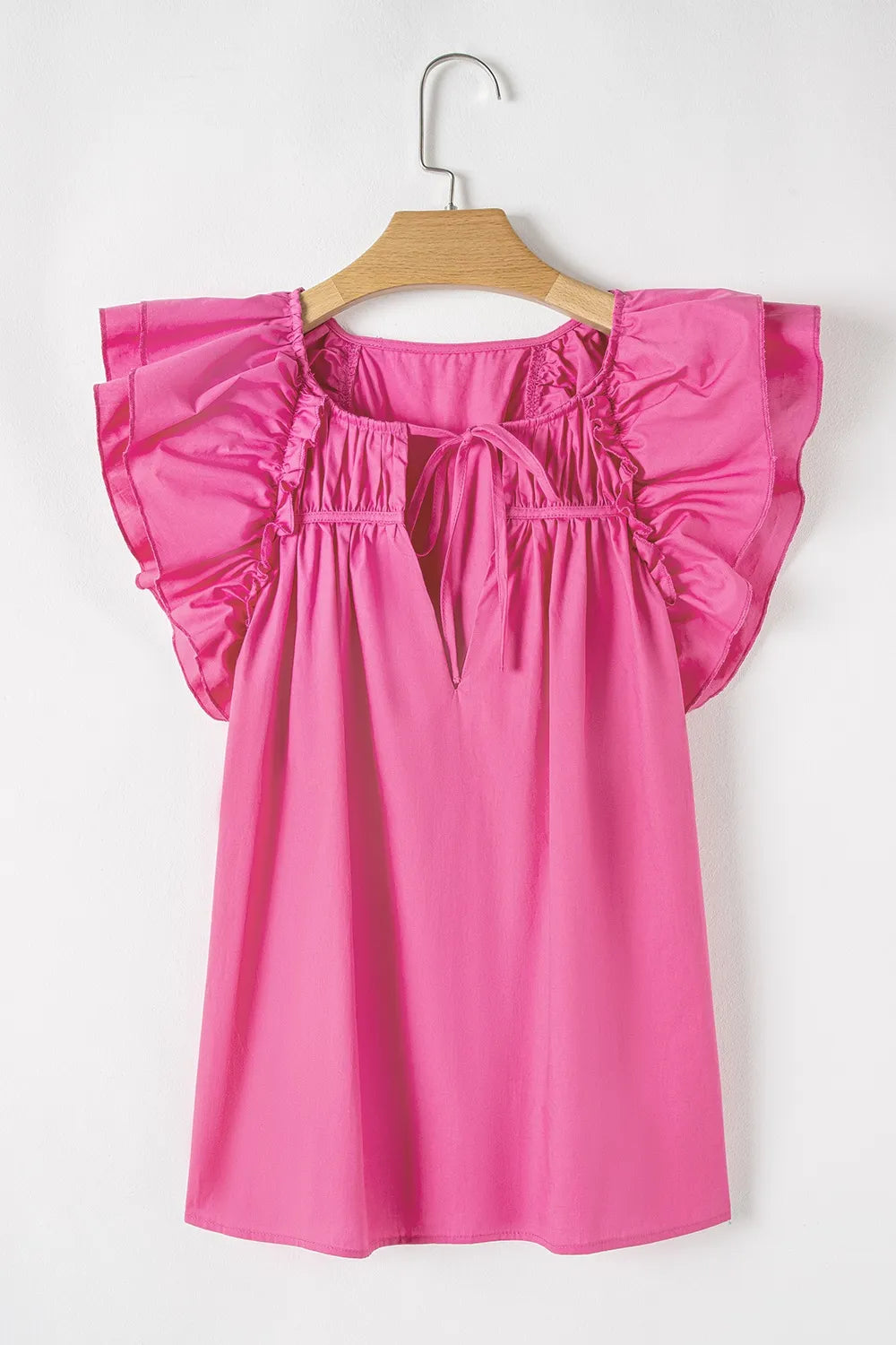 Shirred Tie Neck Ruffled Cap Sleeve Blouse