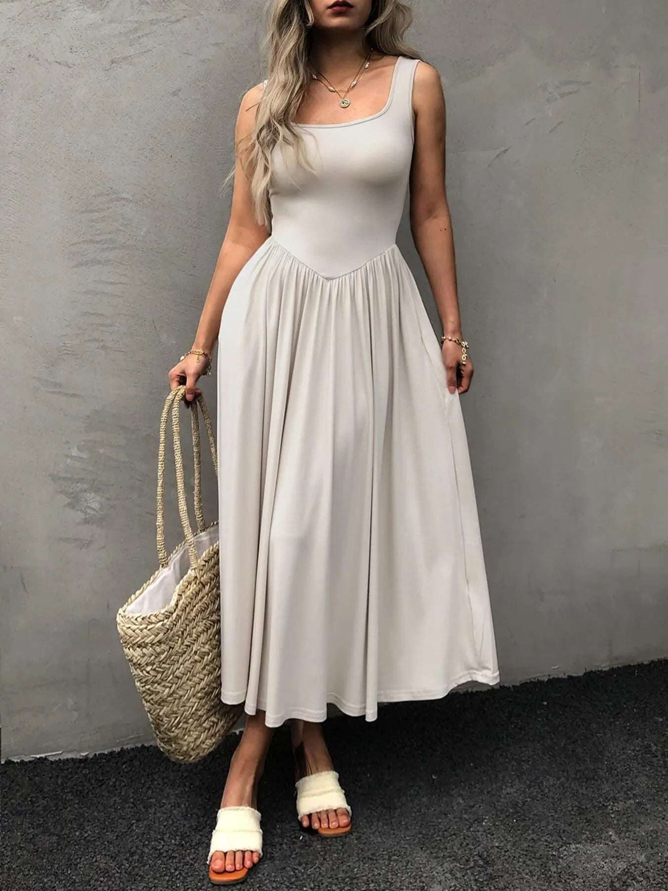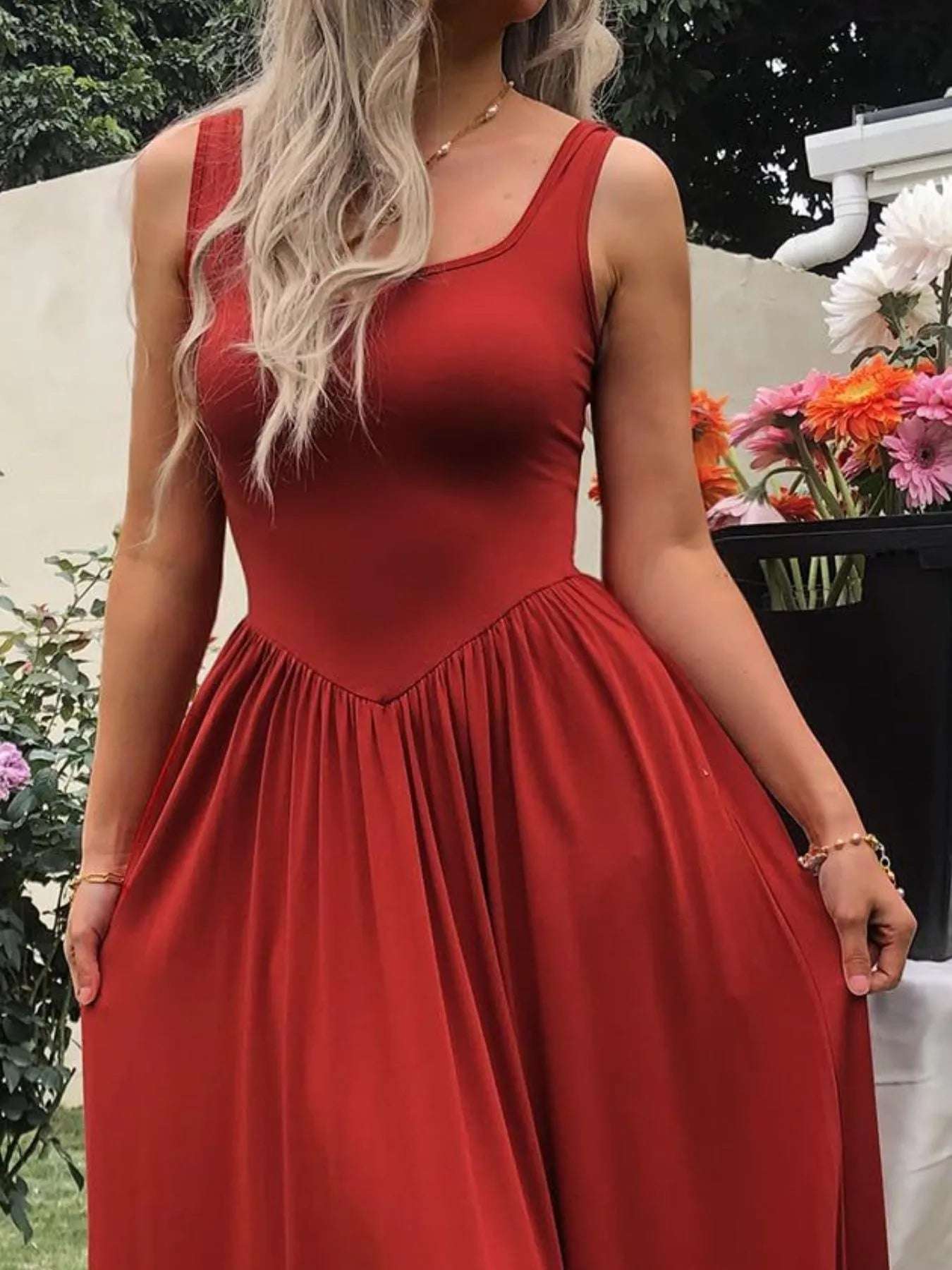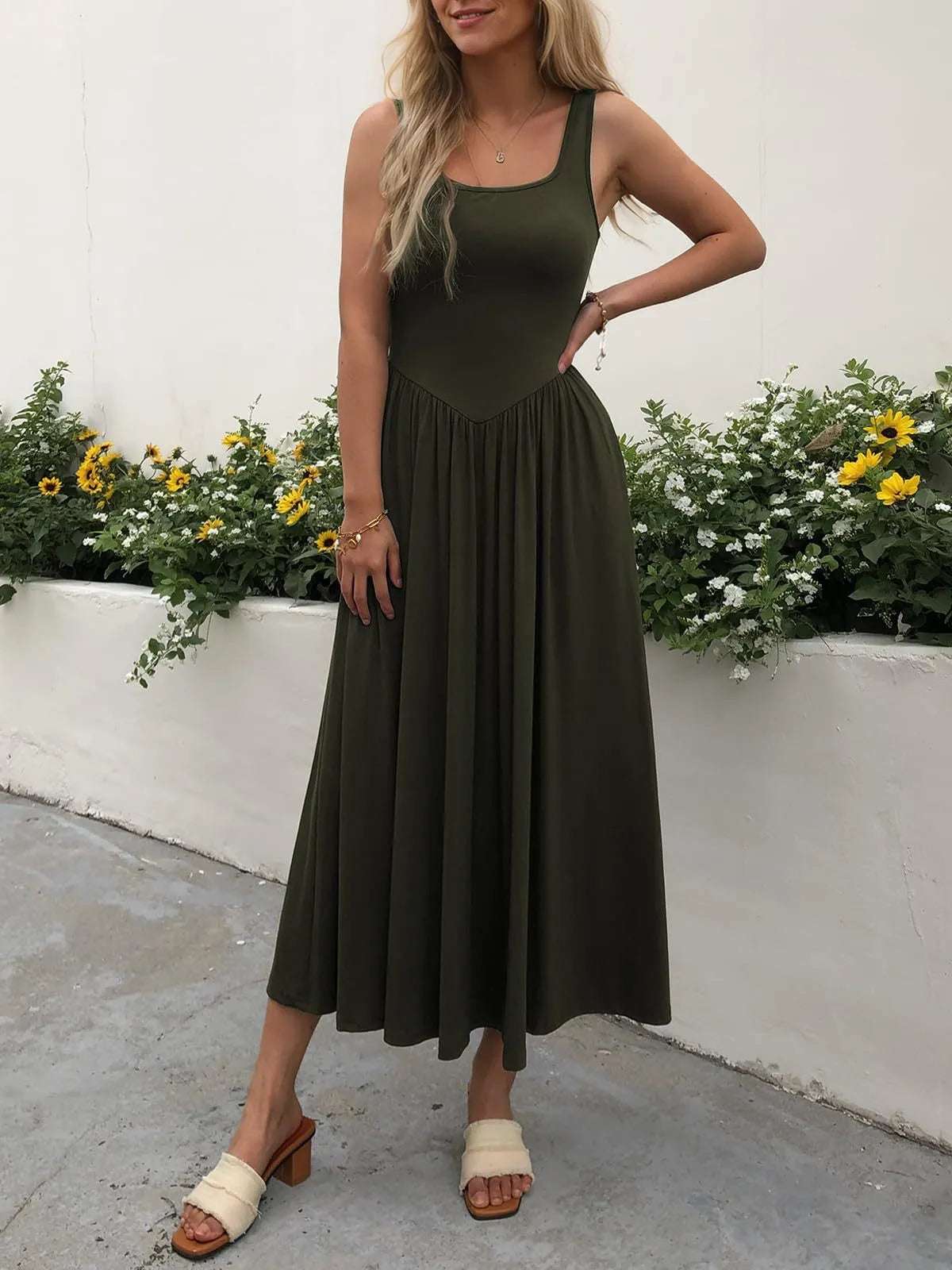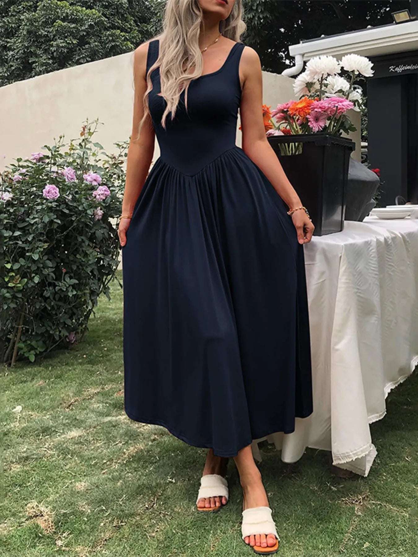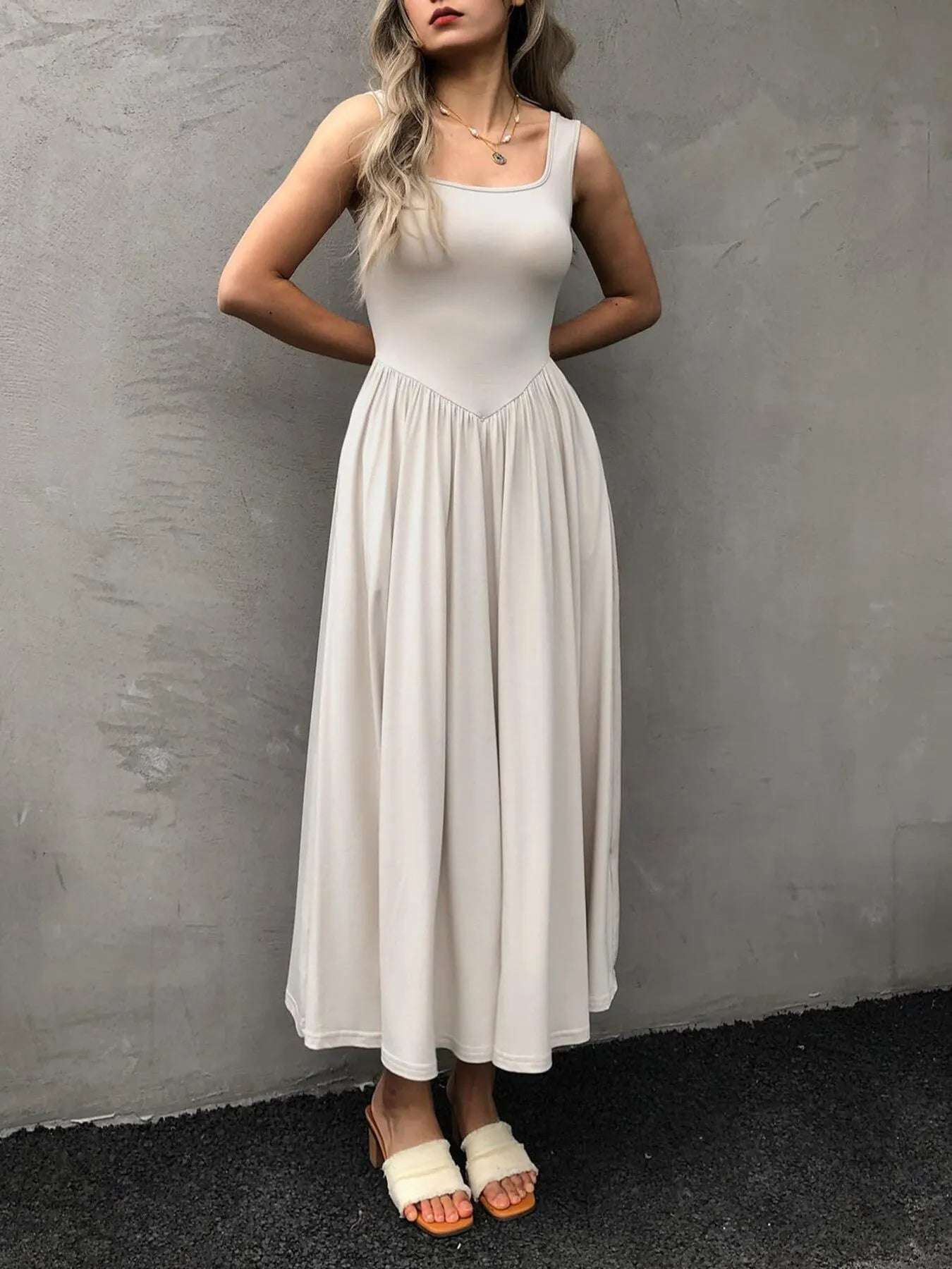 Sleeveless Midi Dress with Gathered Waist