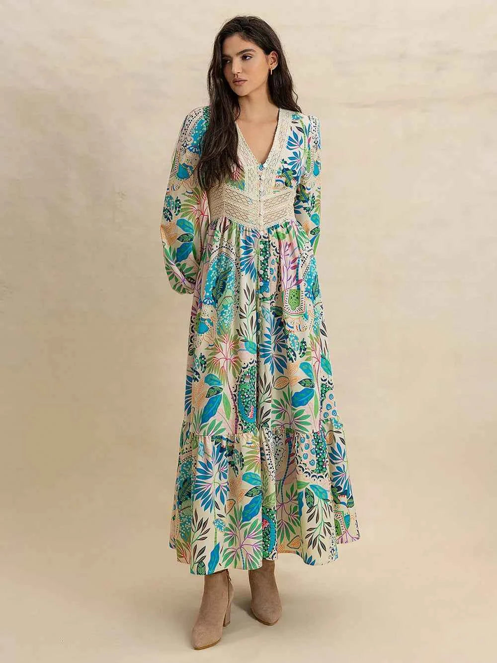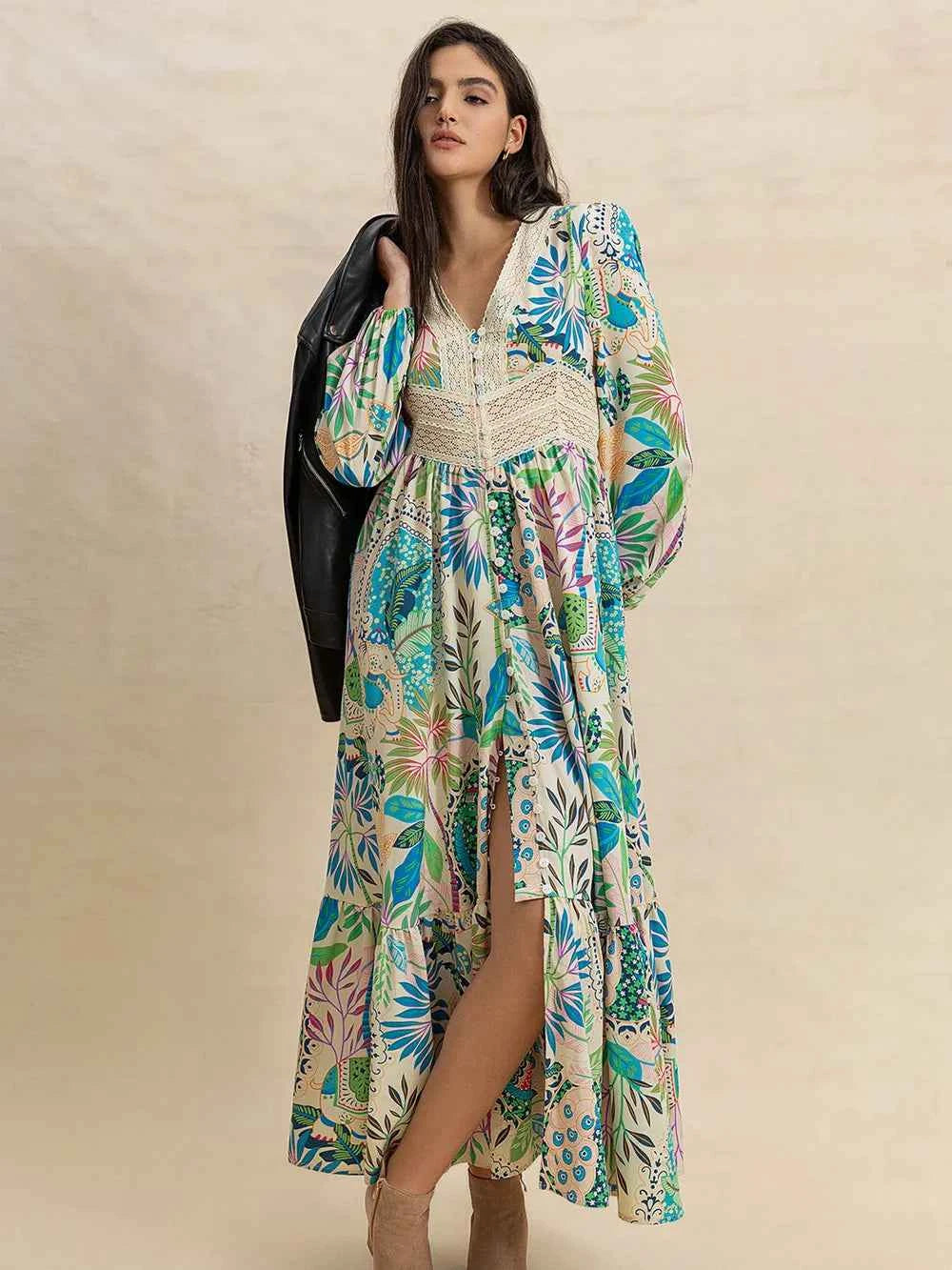 Slit Printed V-Neck Long Sleeve Midi Dress