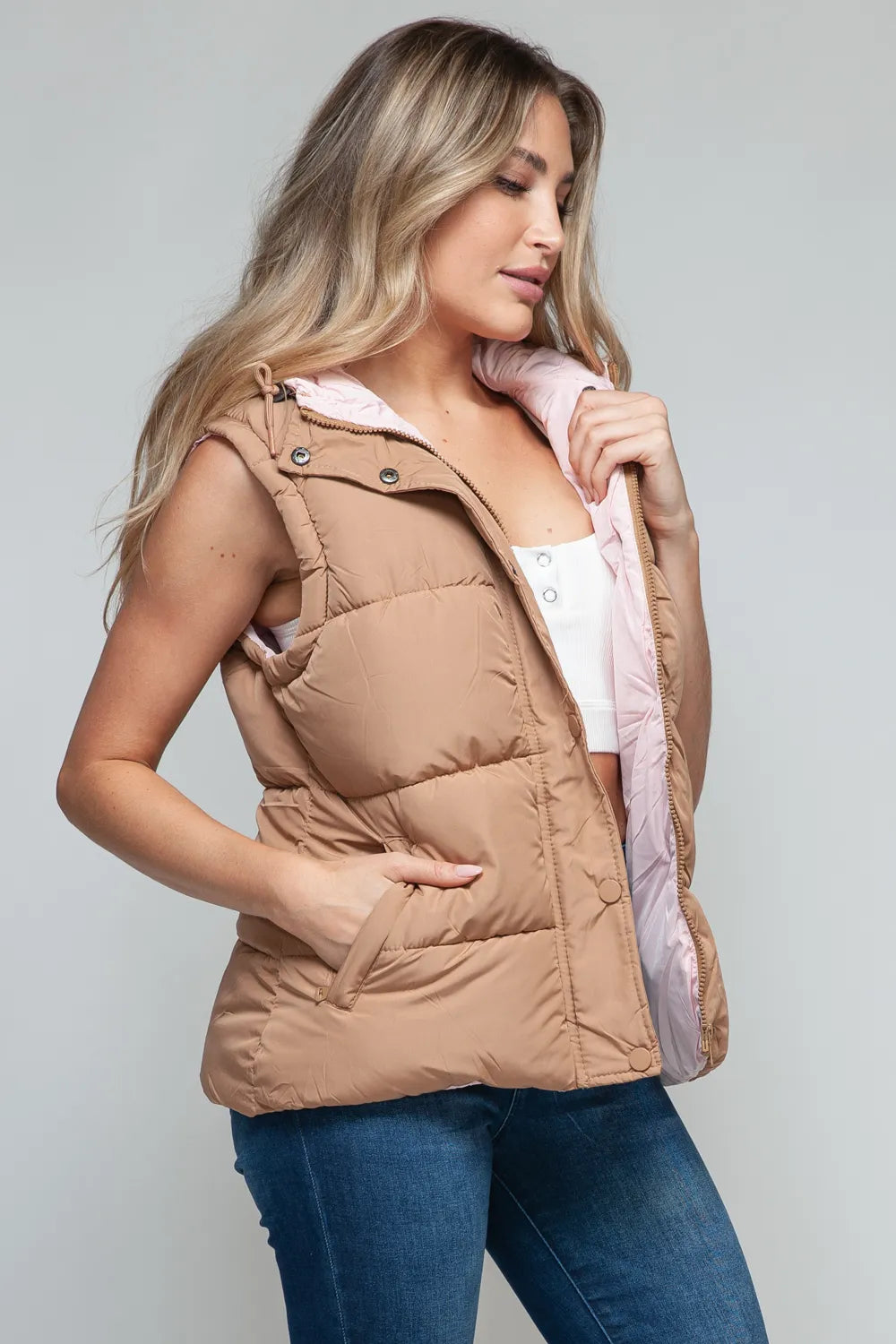 The hooded vest features both snap and zip closures, offering convenience and style. The combination of snap buttons and zippers...