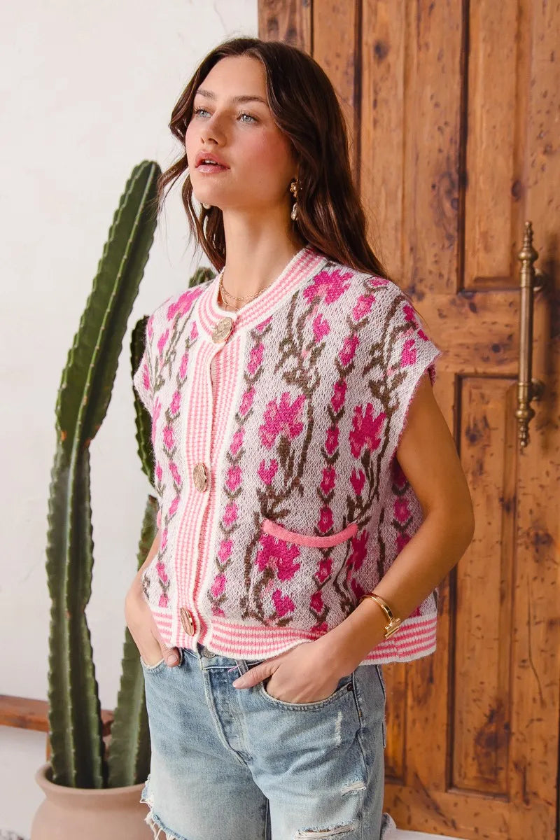 SO ME Button Front Floral and Stripe Knitted Sweater Vest
