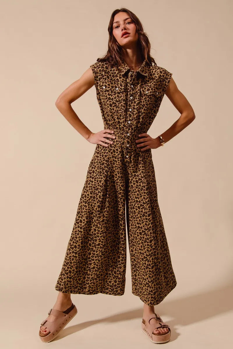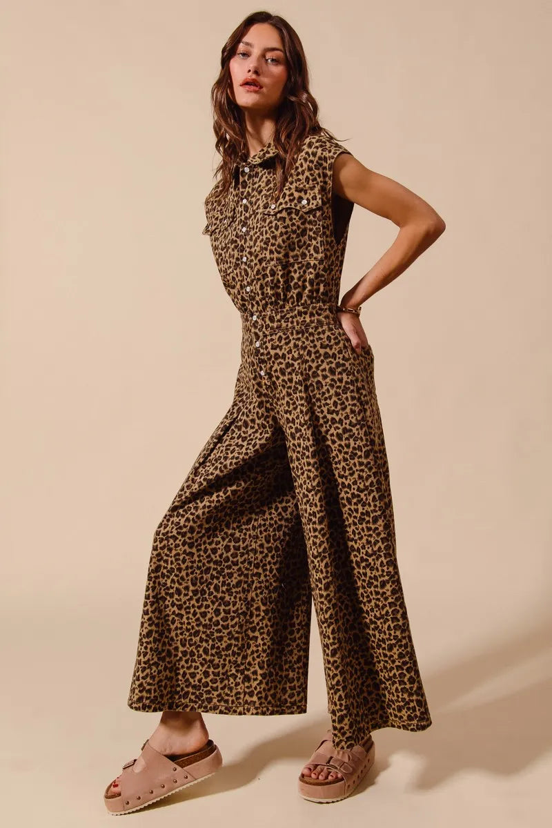 SO ME Wide Leg Leopard Twill Overalls Jumpsuit with Tuck