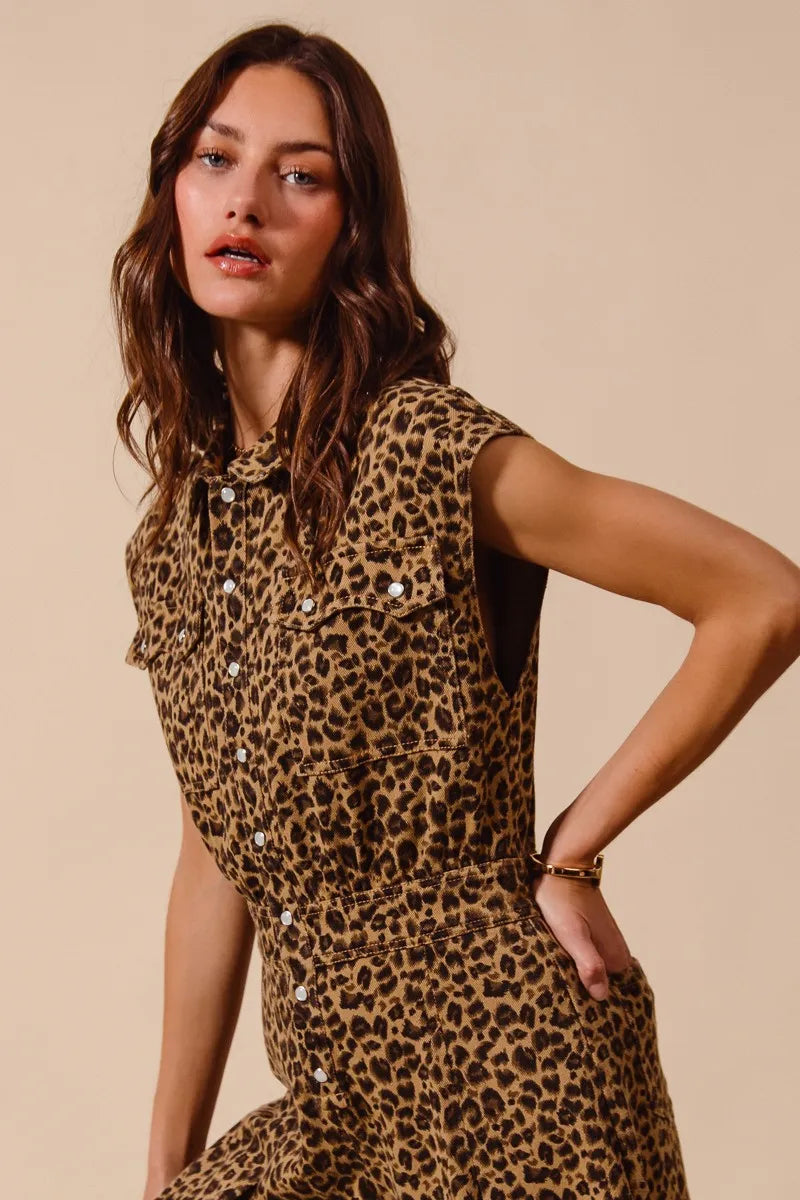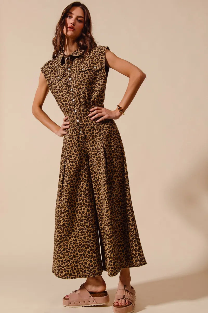 This stunning leopard print jumpsuit features a sleeveless design perfect for warm weather styling. Made from lightweight, flowing fabric that...