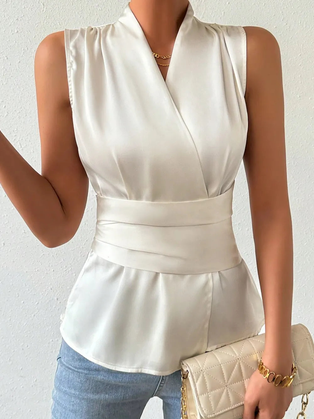 This stunning surplice sleeveless satin blouse combines timeless elegance with modern sophistication. Crafted from premium satin material, it features a...