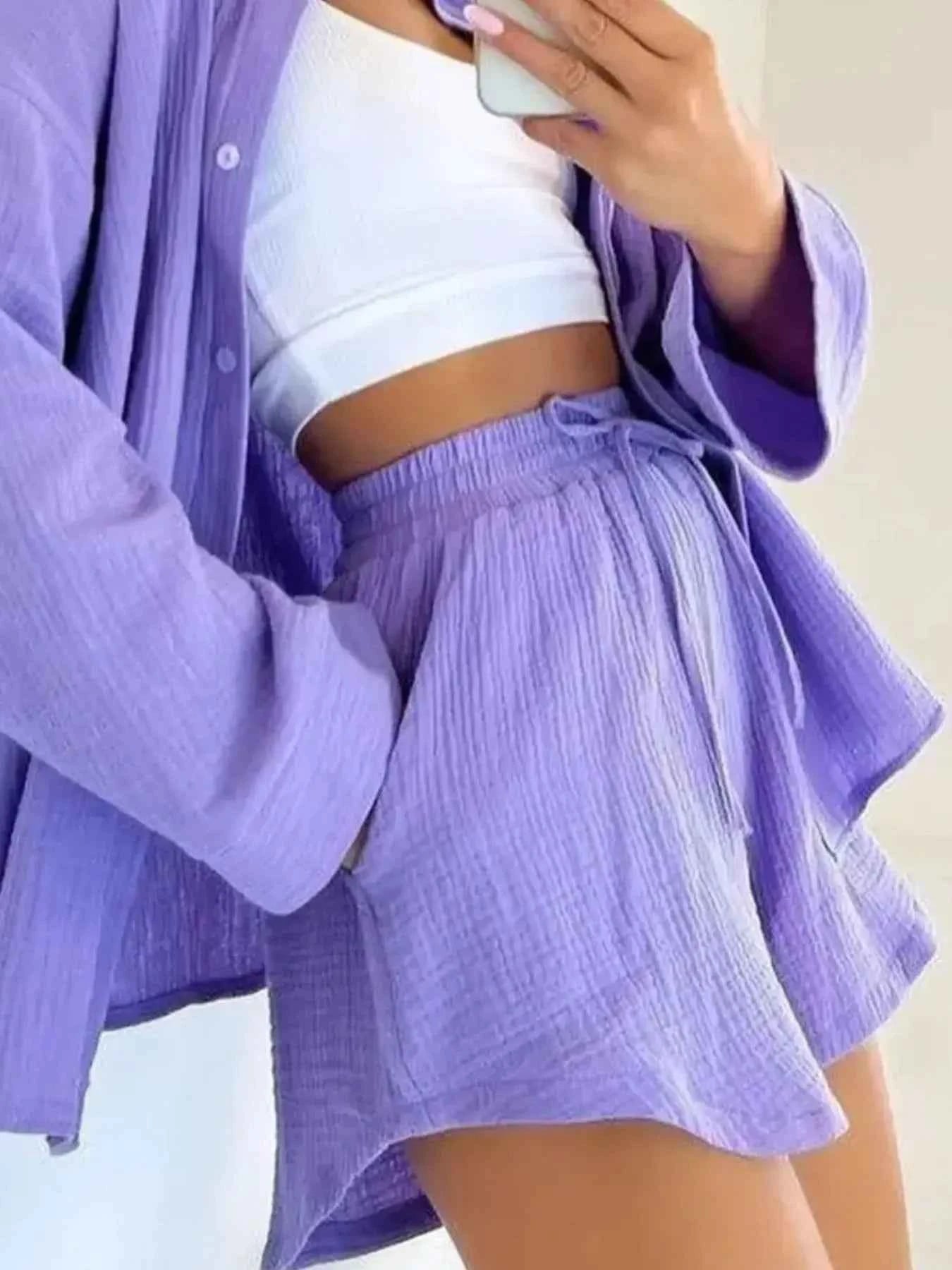 This Texture Button Up Shirt and Shorts Set exemplifies sustainable fashion designed to reduce environmental impact without compromising on style...