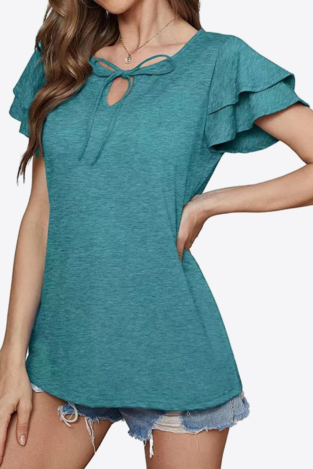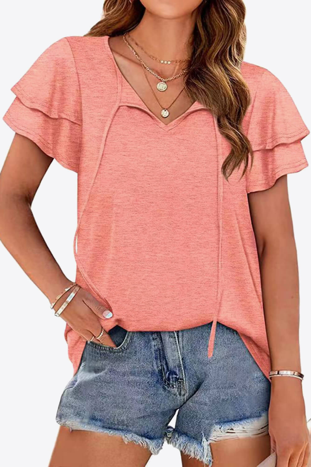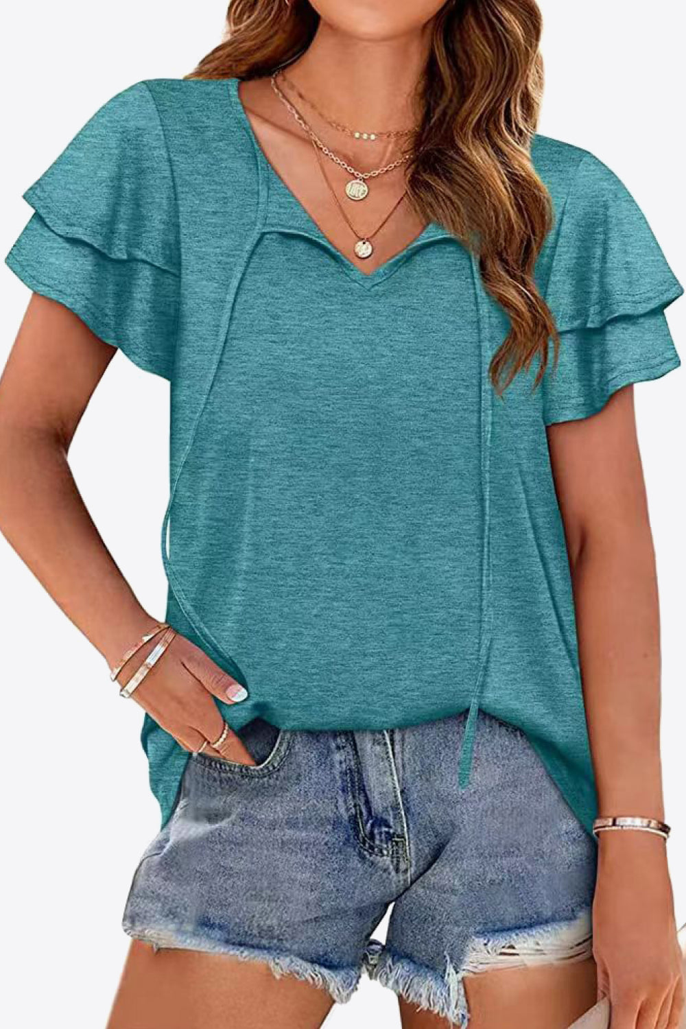 Sizing category: Regular Pattern type: Solid Style: Casual, minimalist Features: Tie Neckline: Notched Length: Long Sleeve length: Short sleeves Sleeve...
