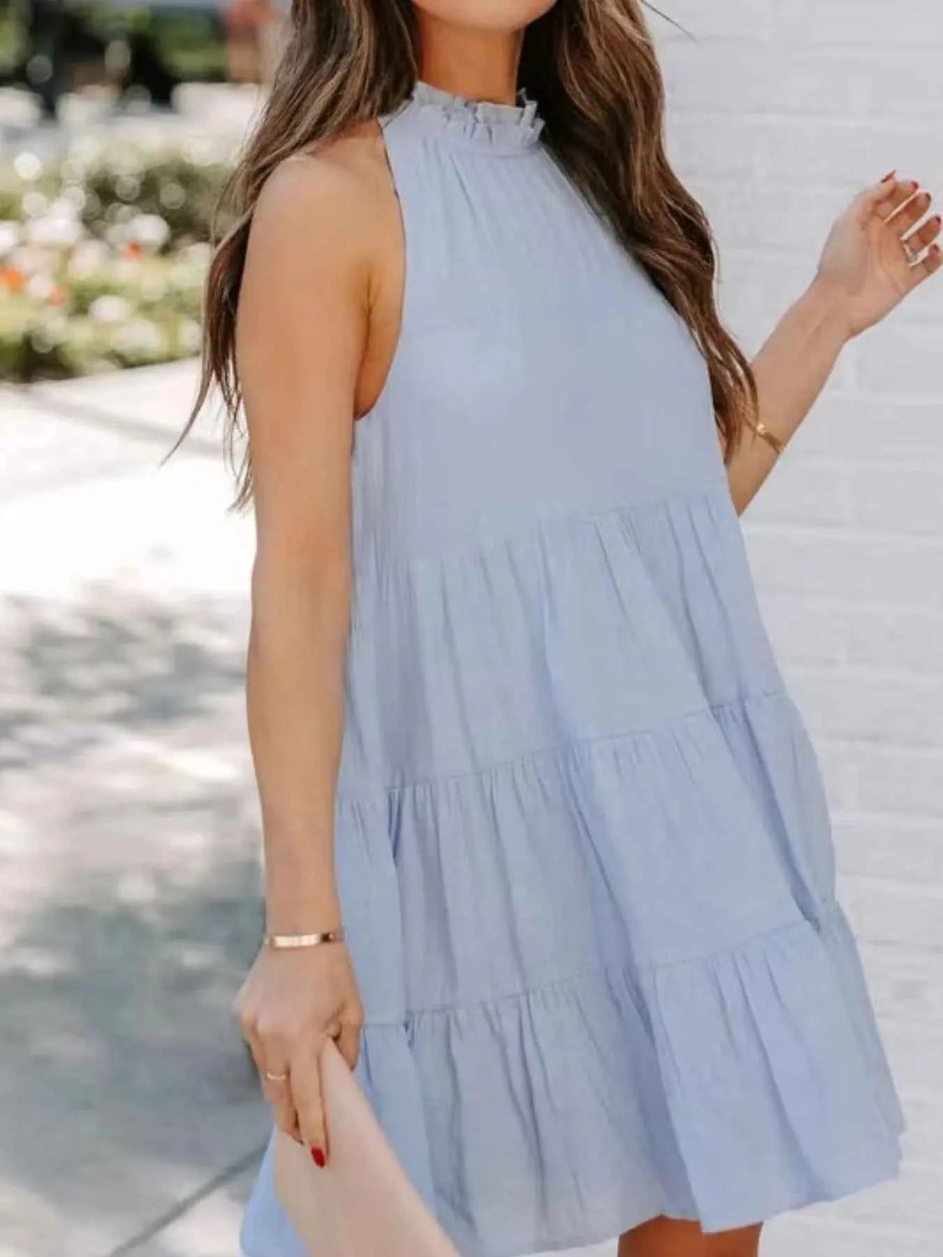 - Elegant tiered design with sleeveless silhouette for breathable comfort