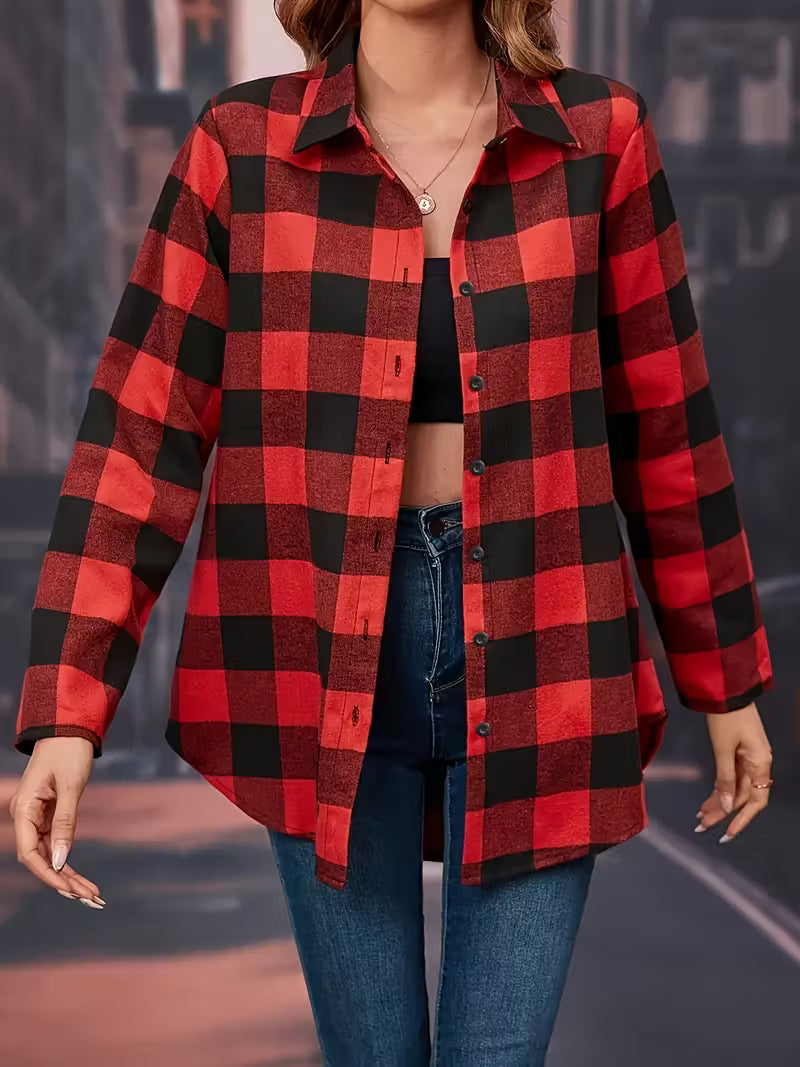 Women's Red & Plaid Button-Up Shirt - Long Sleeve Casual Blouse with Lapel